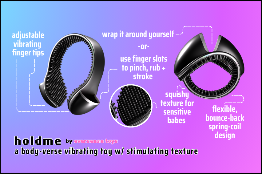 ❤︎ holdme ❤︎ has a flexible, spring-coil design that can also be expanded between your fingers for all kinds of fun play! its vibrating fingertips are sensational for any sweet spot. because of its natural wrapping form, this toy can stay in place without your hands; whether that's comfier for your mobility, or if using your hands makes you feel dysphoric.